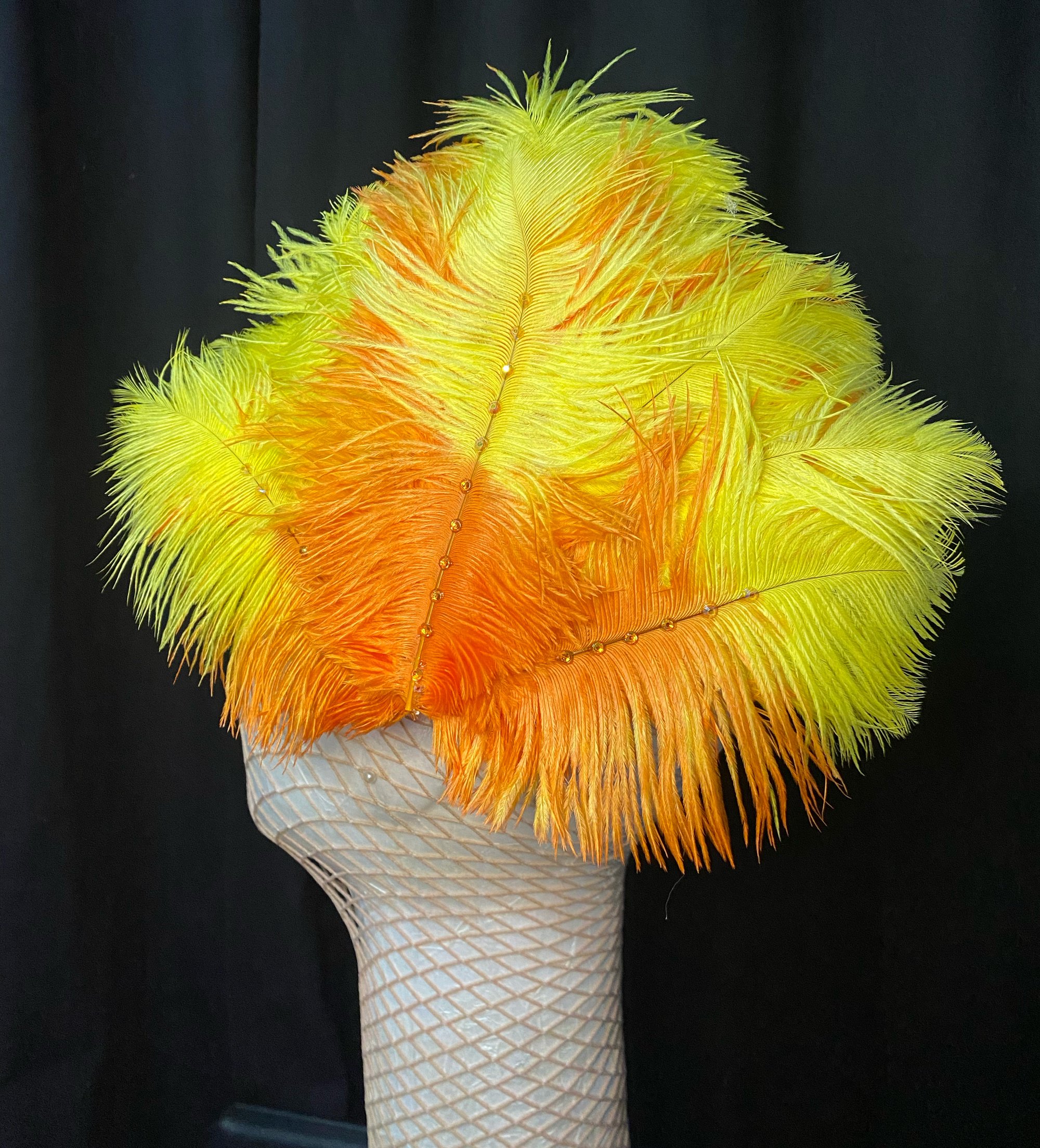 10 inches wide by 8 inches high. Rhinestoned ostrich feathers.