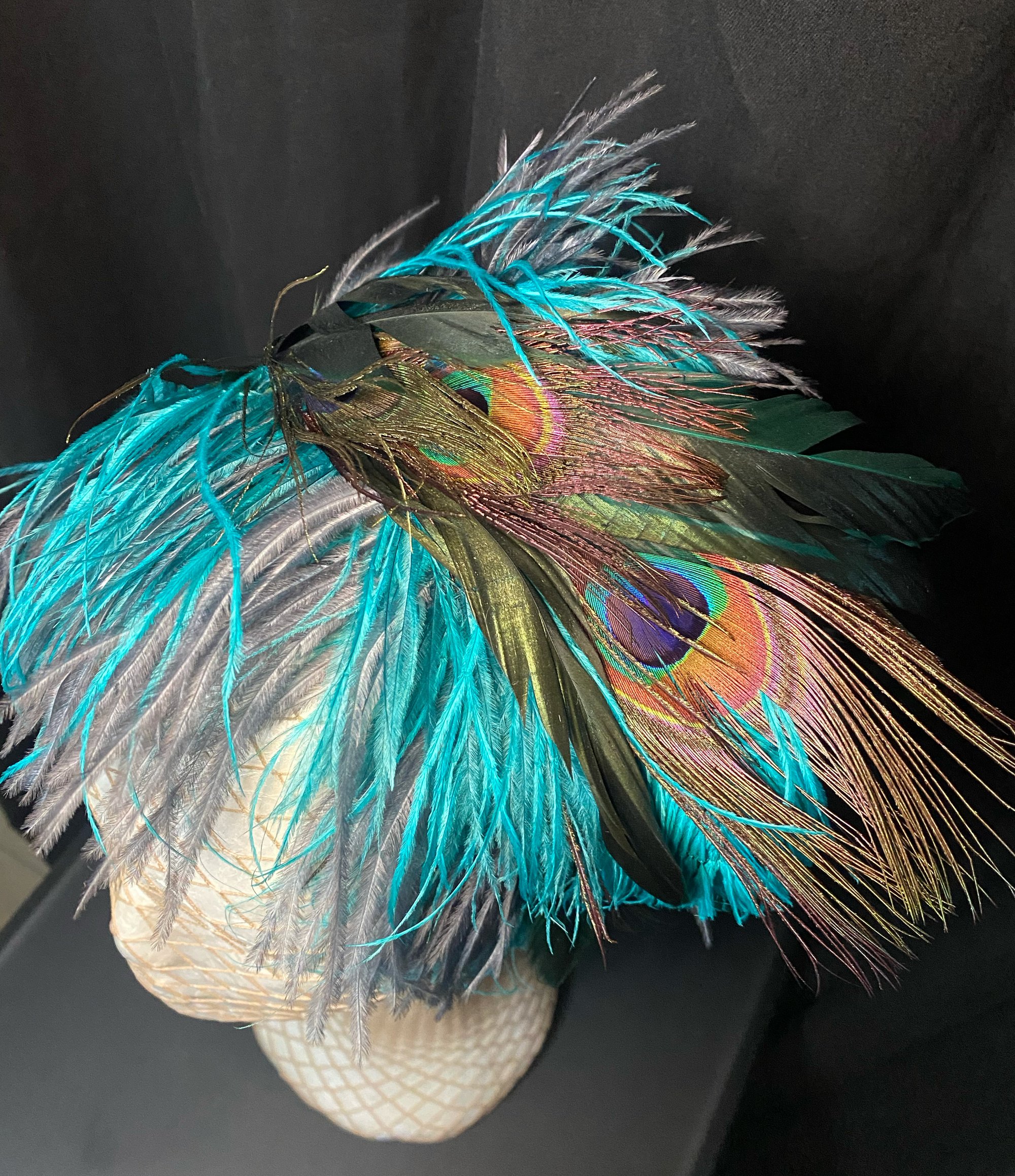 A lightweight flirty mix of ostrich and peacock feathers on a sturdy band.
