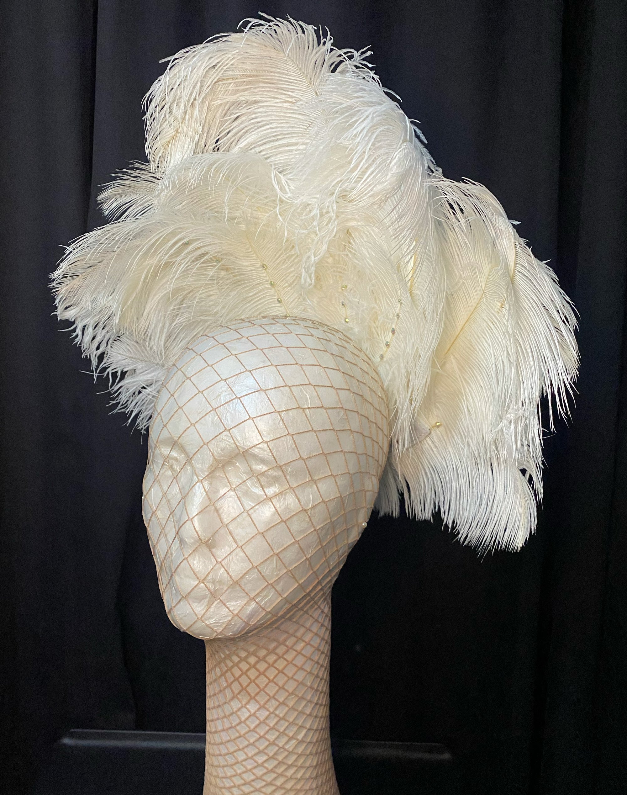 17 inches wide by 13 inches high. Rhinestoned ostrich feathers.